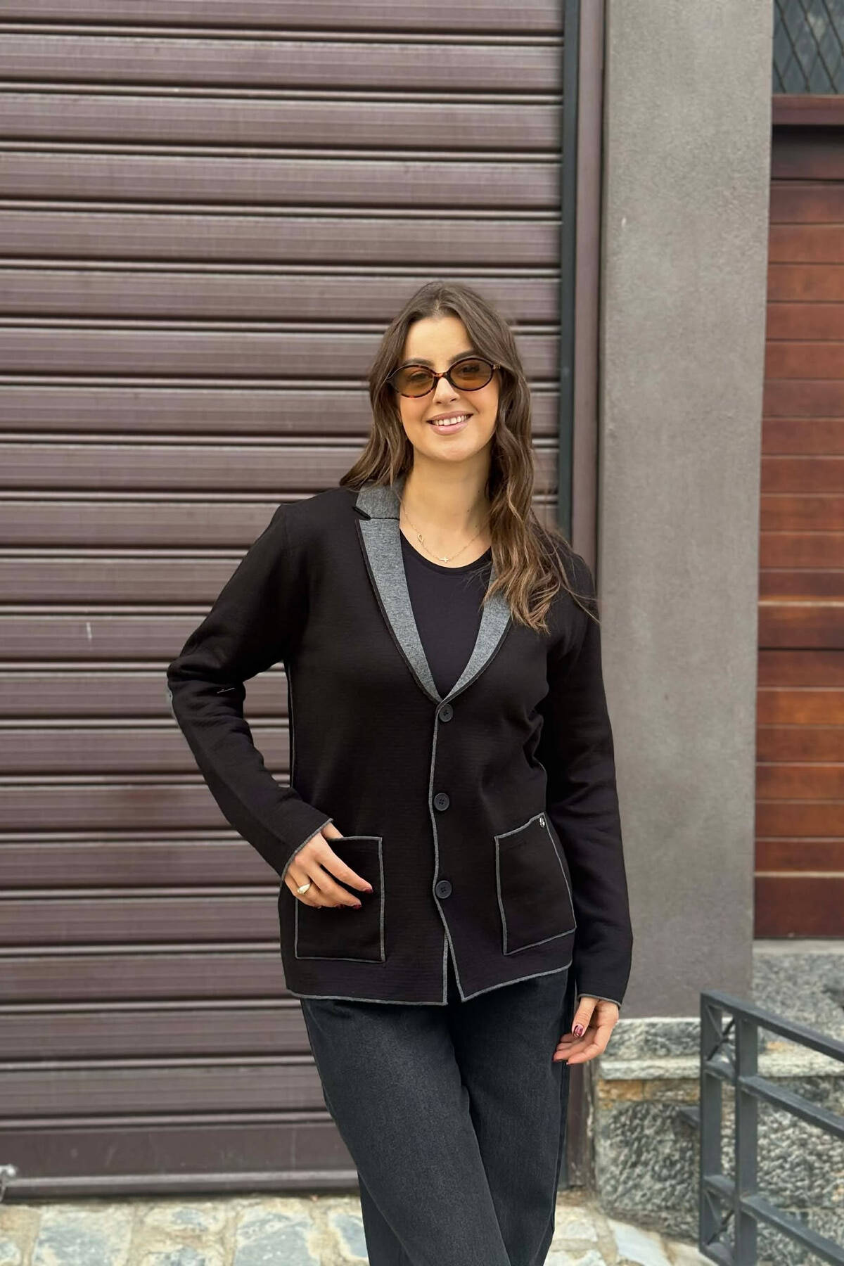 XHAKETË ME KOPSA TË THJESHTA DHE ME DETAJIN E XHEPAVE PËR FEMRA NË NGJYRË TË ZEZË