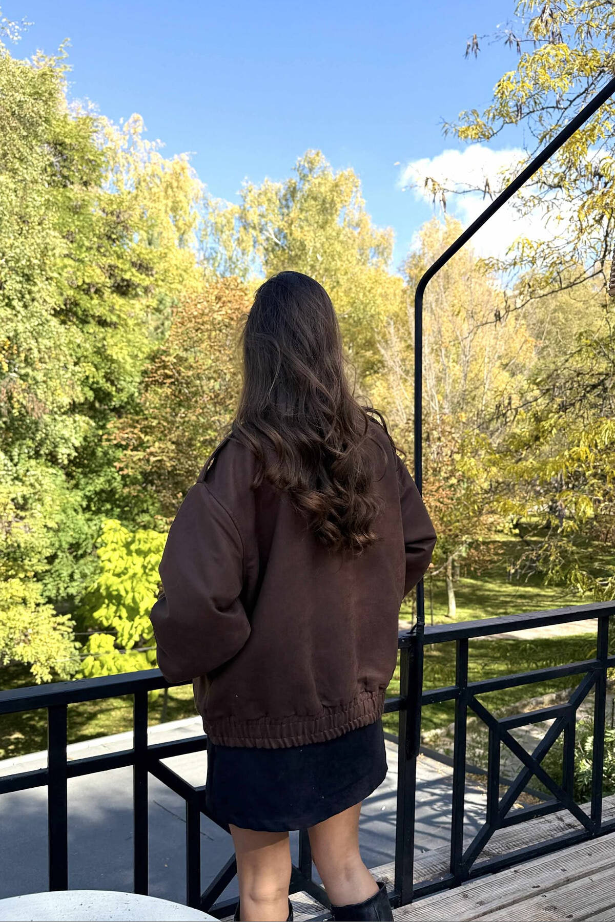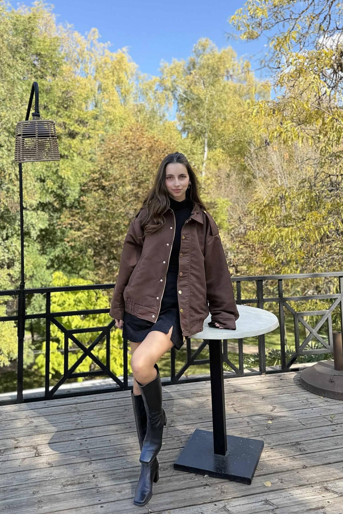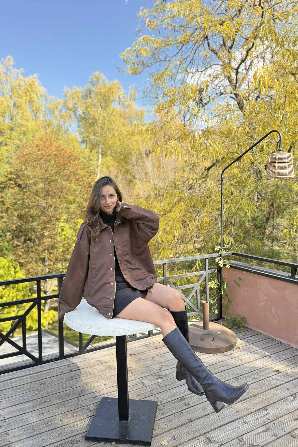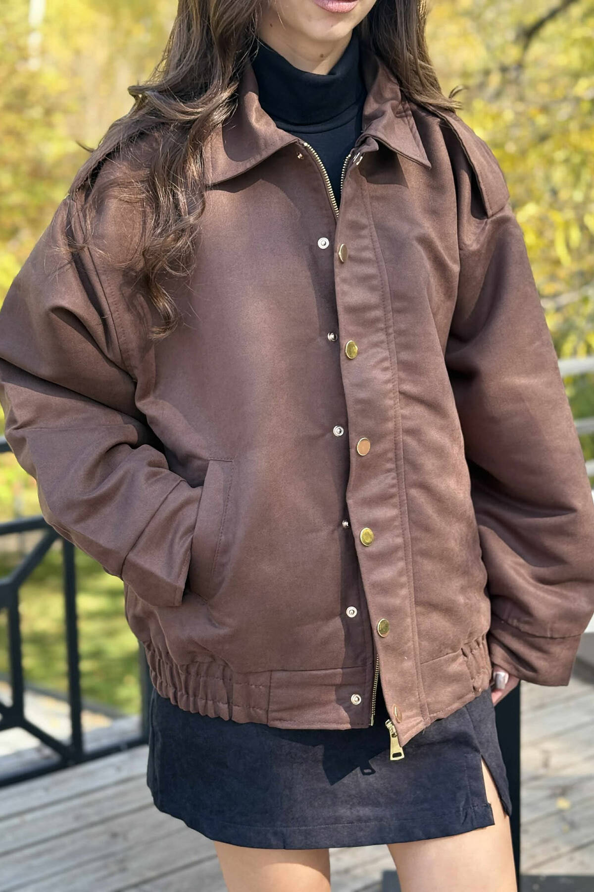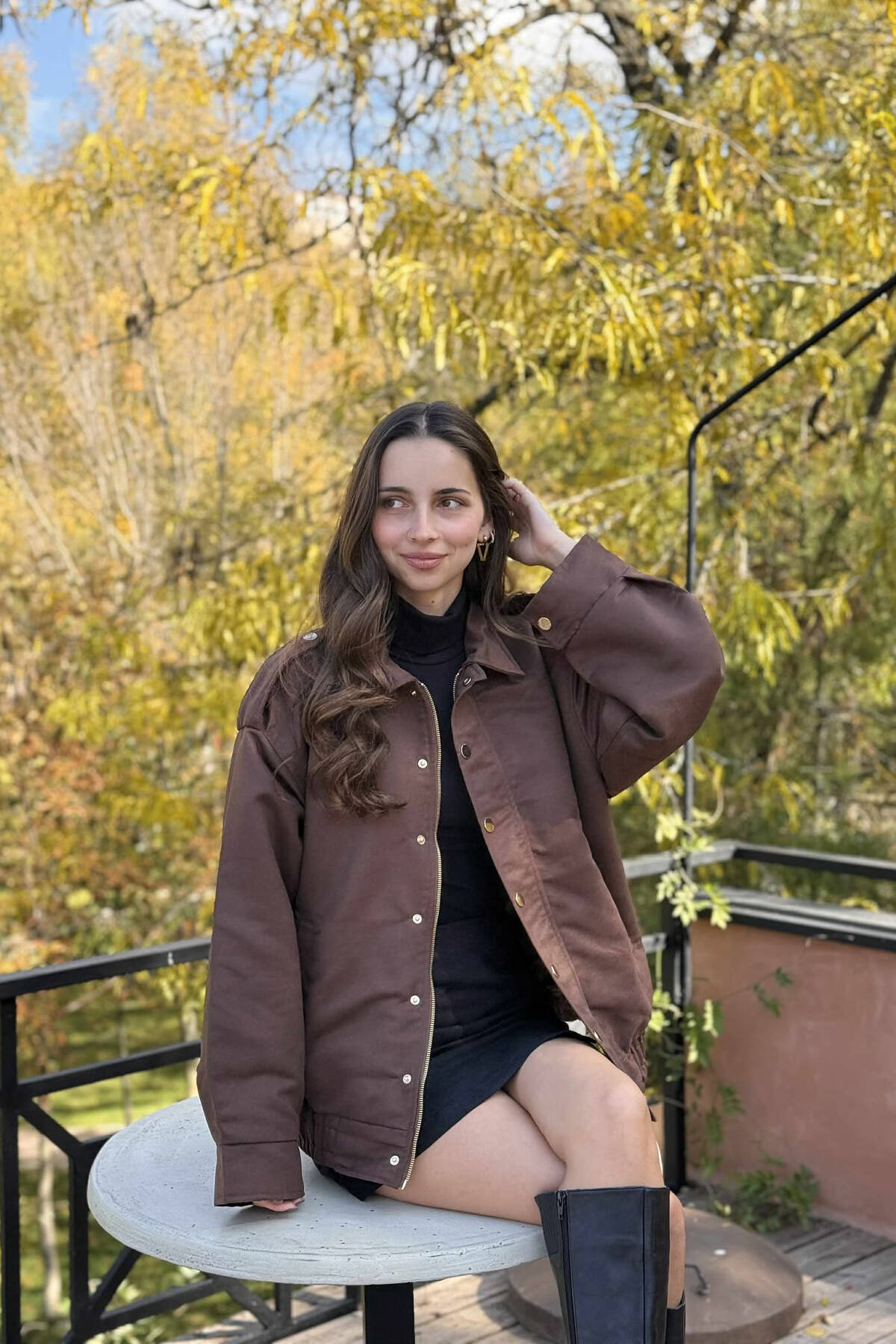 XHAKETË NJË NGJYRËSHE ME BUTONA DHE ZINXHIR PËR FEMRA NË NGJYRË KAFE TË ERRËT