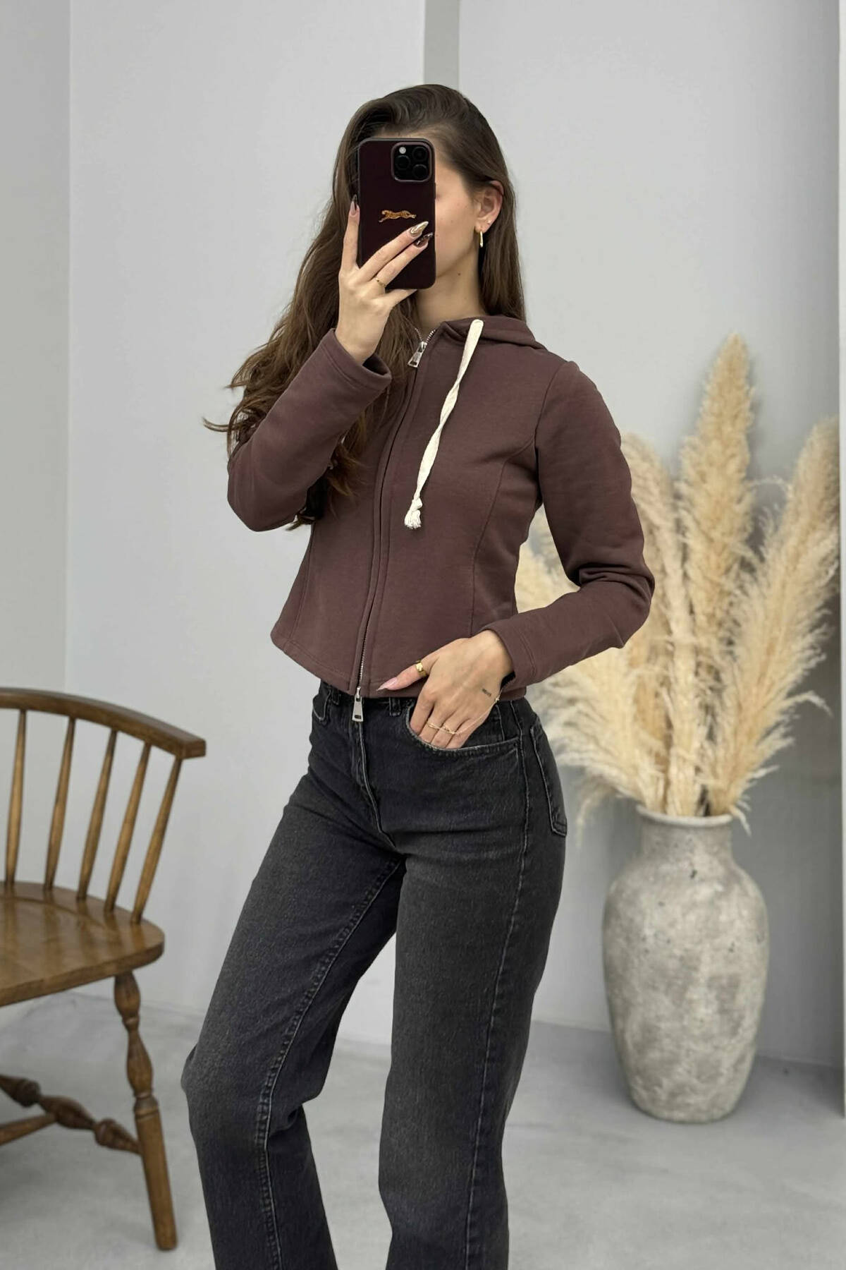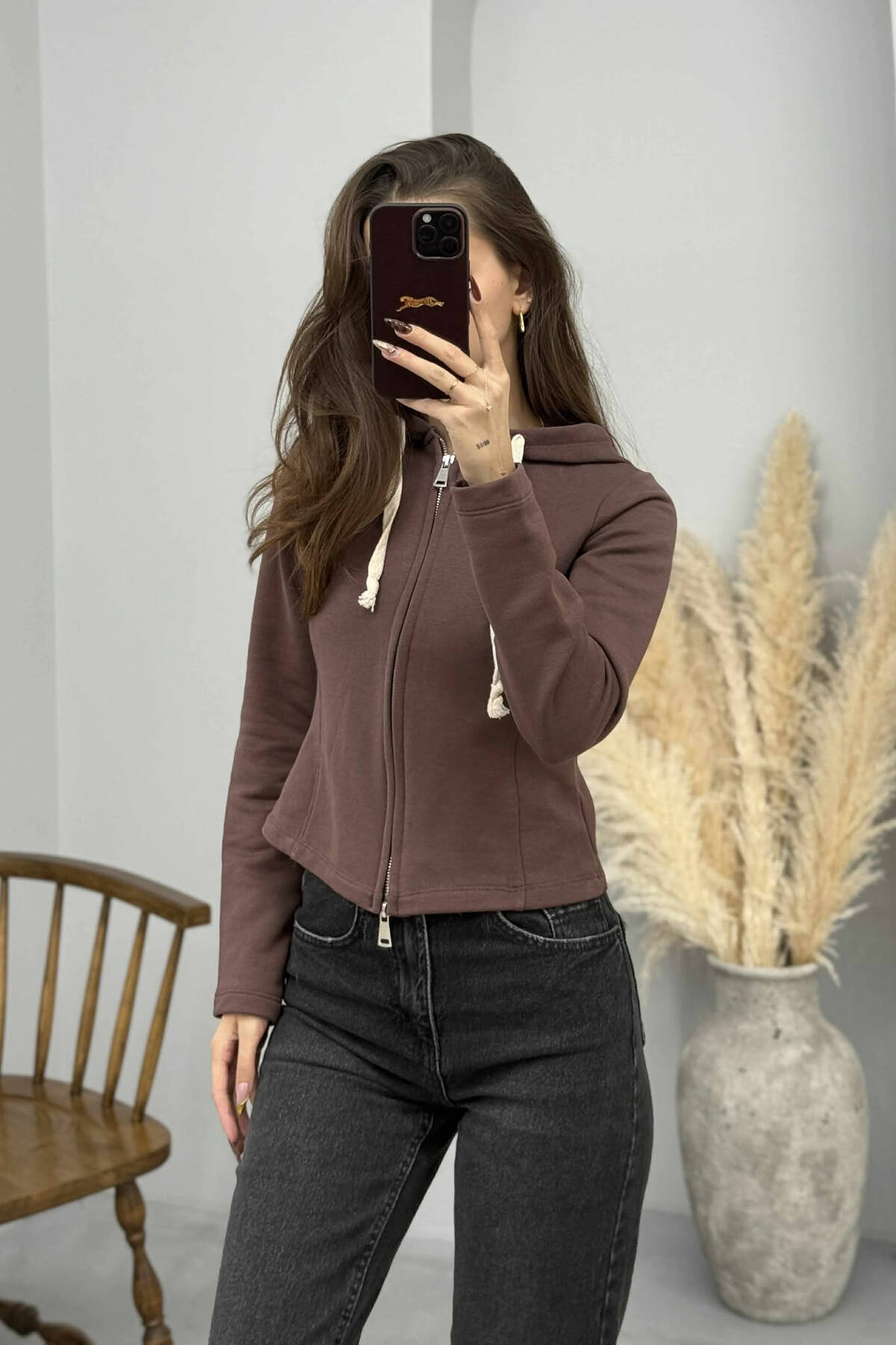 XHAKETE NJE NGJYRESHE ME KAPUÇ DHE ZINXHIR PER FEMRA NE NGJYRE KAFE
