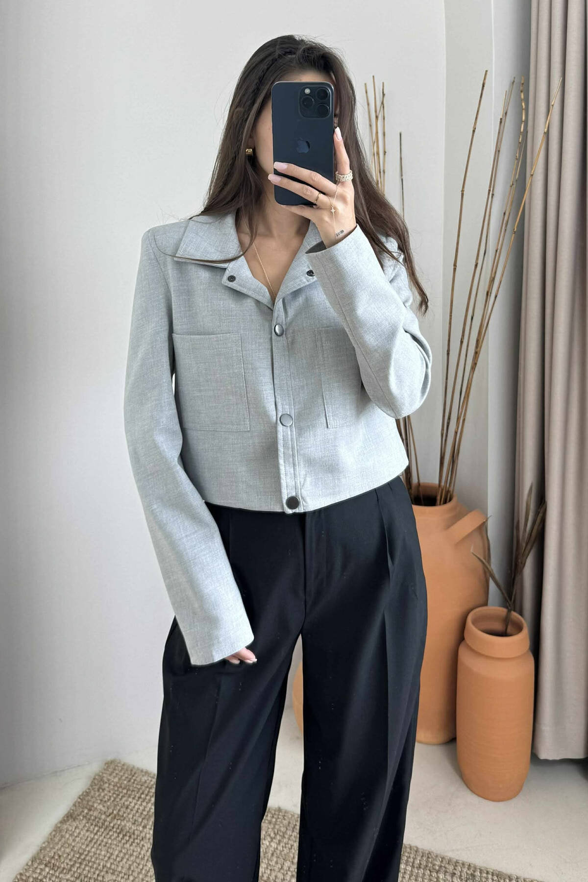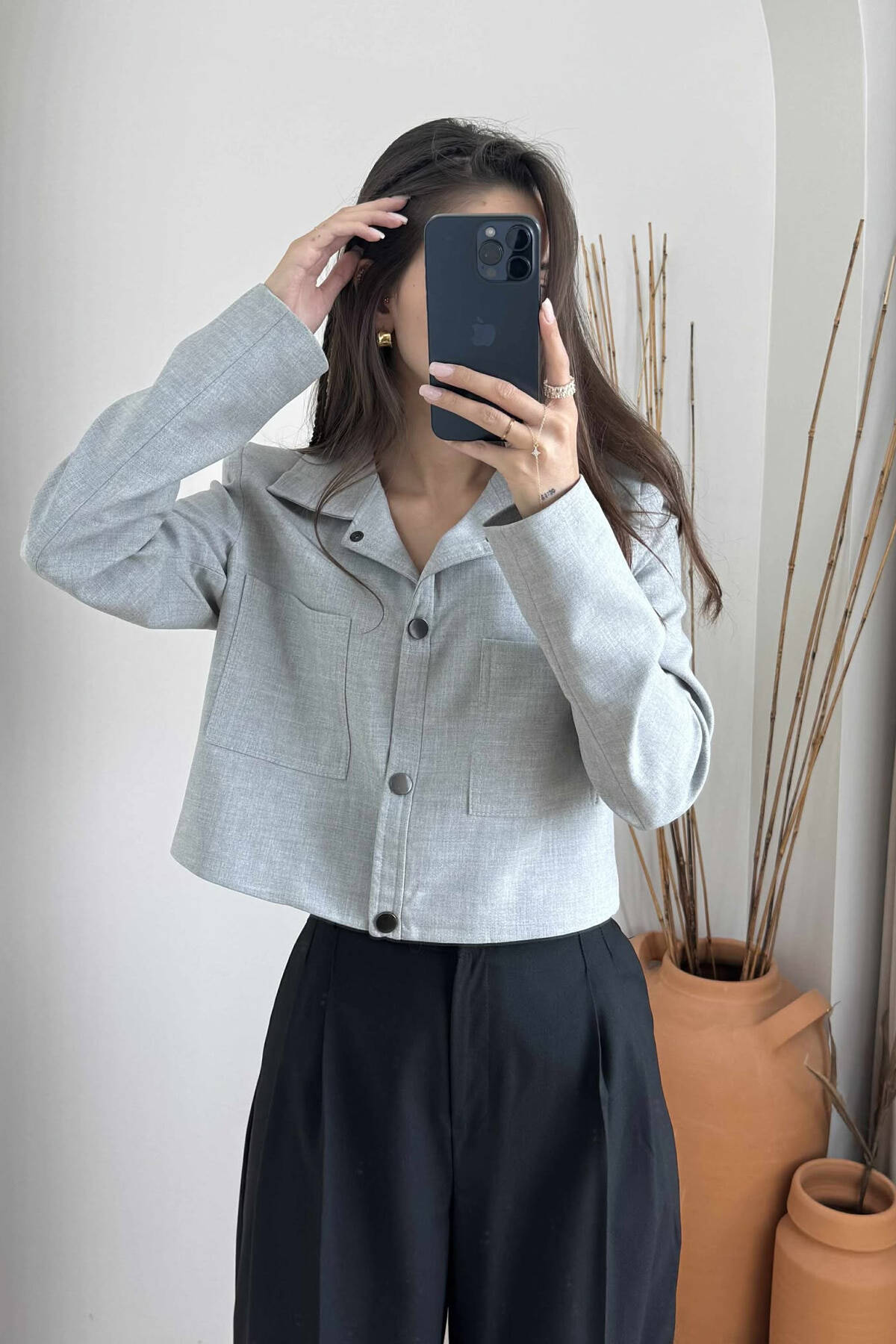 XHAKETË NJË NGJYRËSHE ME KOPSA PËR FEMRA NË NGJYRËN GRI E ZBARDHUR