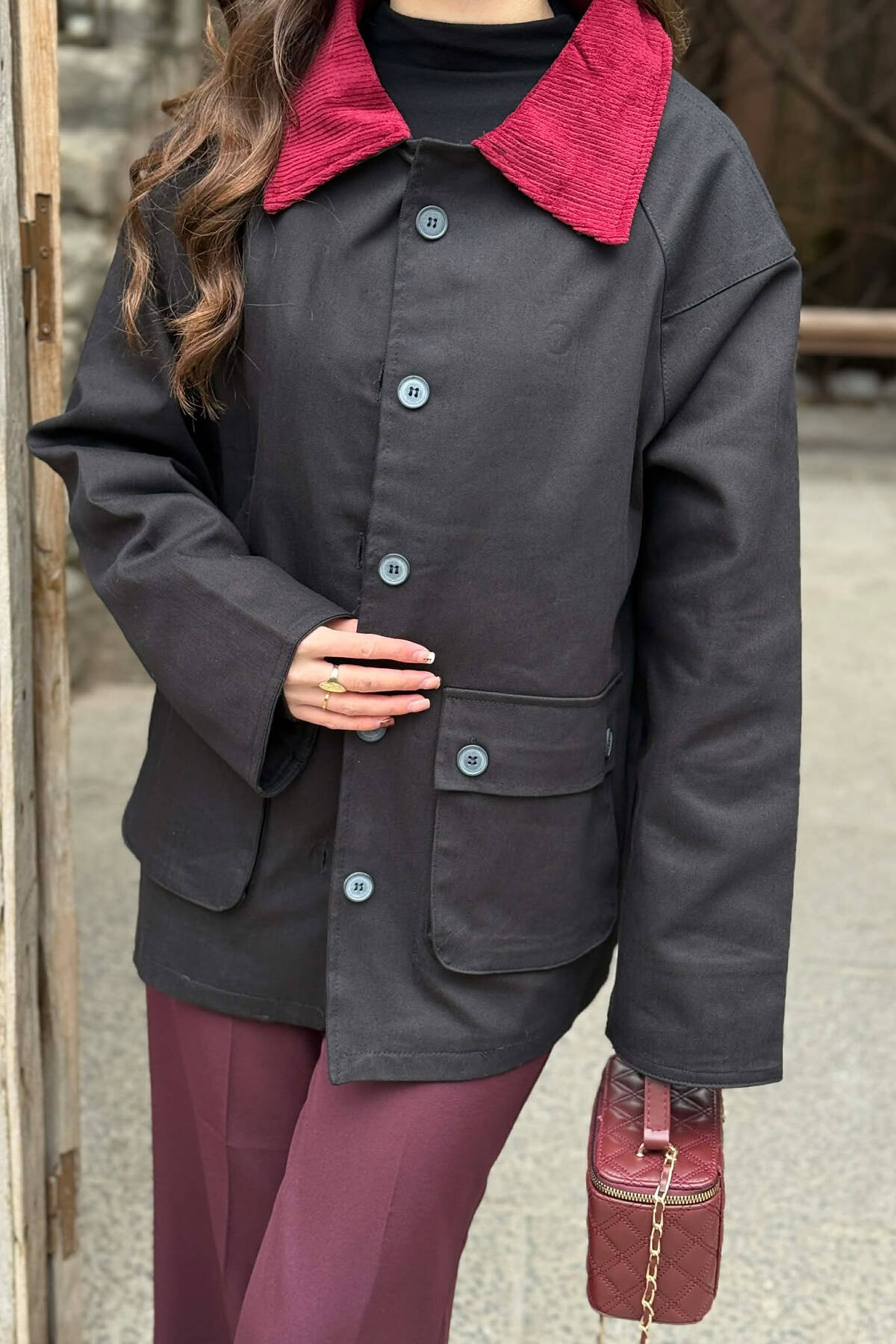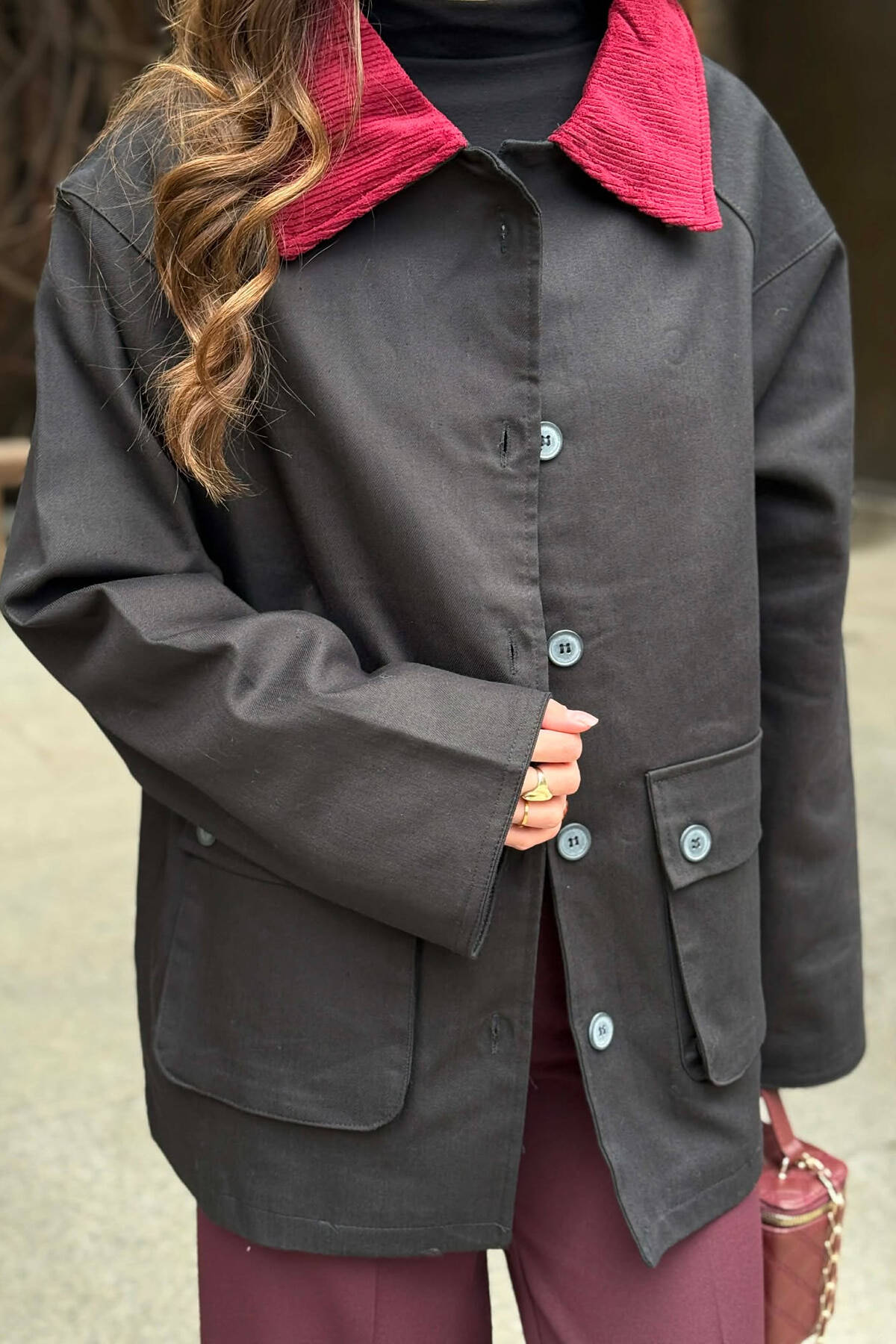 XHAKETË NJË NGJYRËSHE ME DETAJIN E LIDHSES PËR FEMRA NË NGJYRE VISHNJE TE ERRET