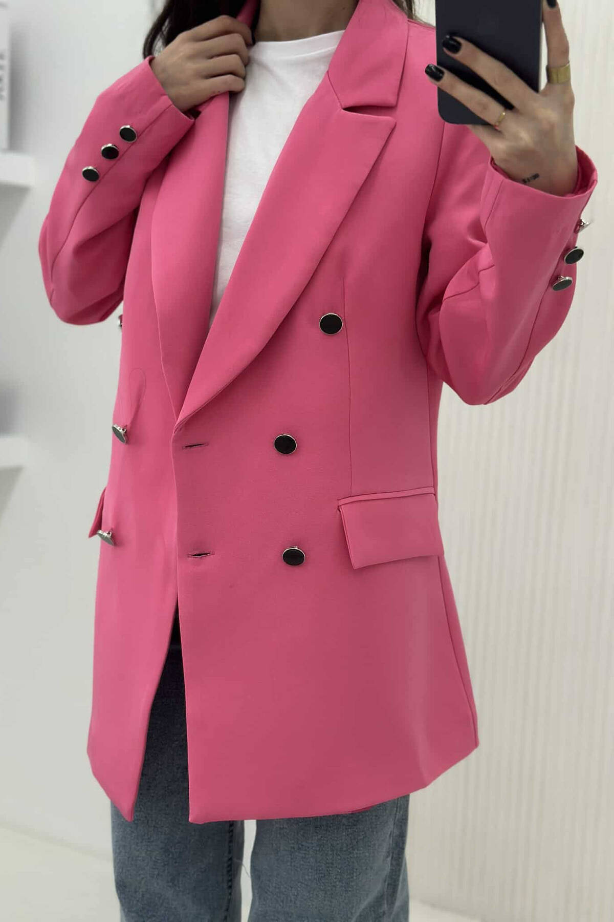 Bejeni tuajen xhaketen klasike me detajet e kopsave ne ngjyre te zeze dhe silver , vjen me nje prerje te drejte me nje super material . Kjo xhakete ju ofron stil , klas dhe elegance .