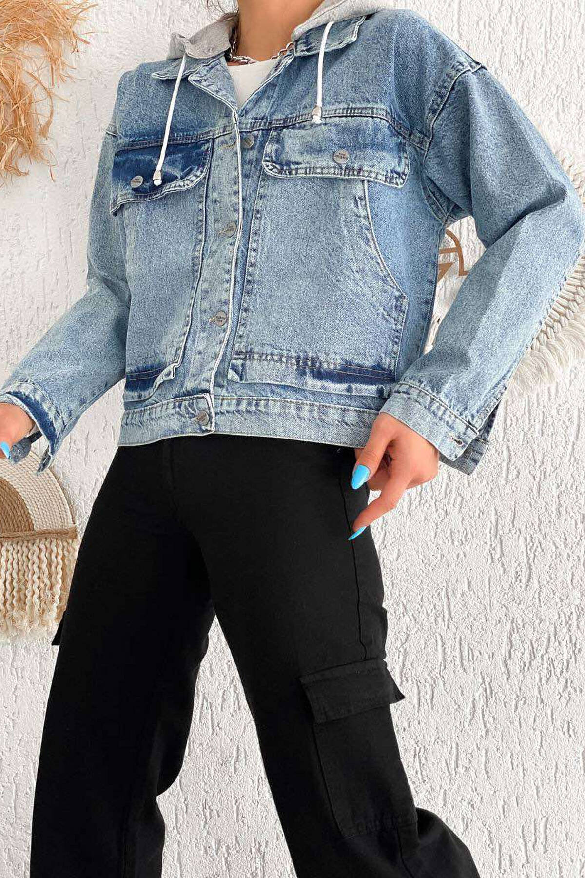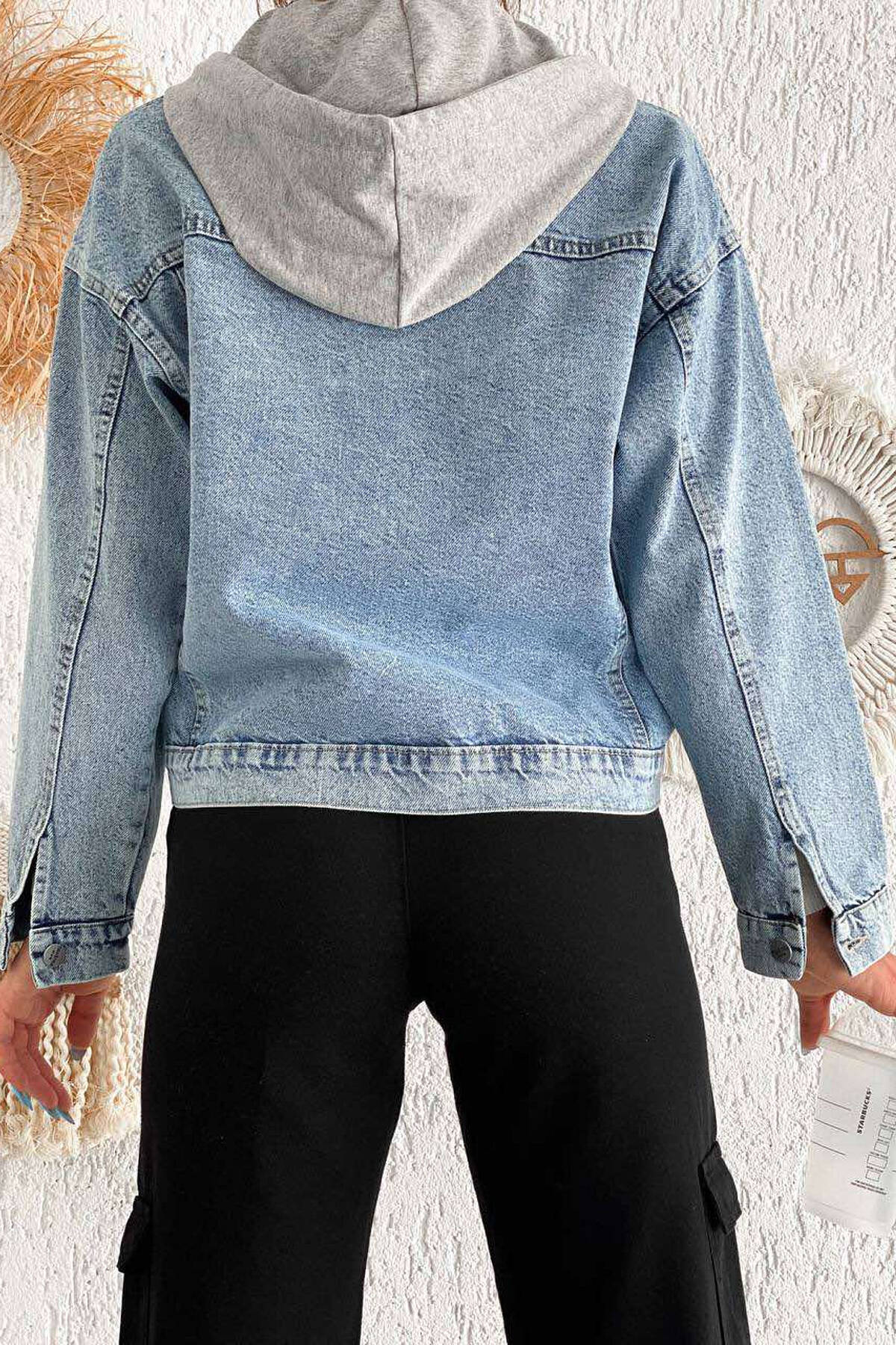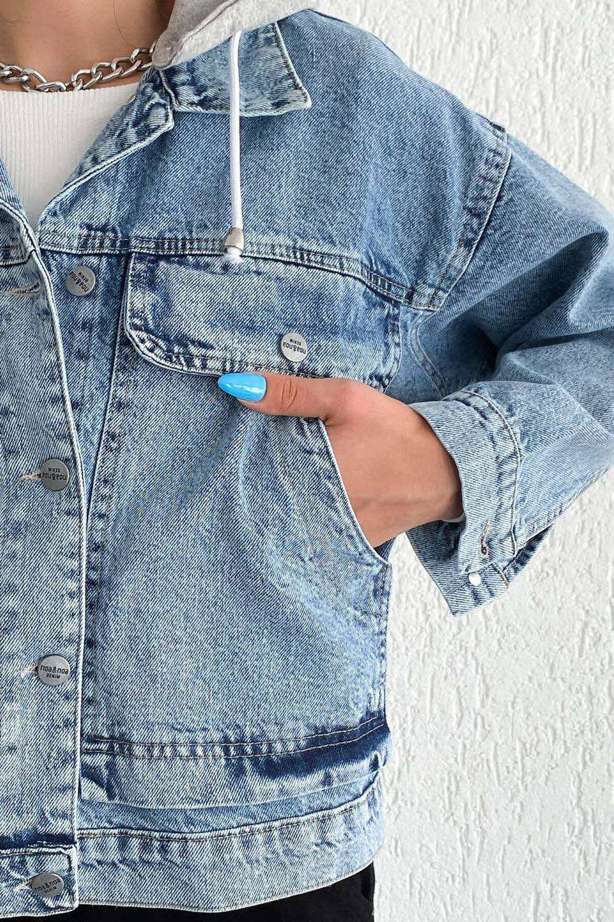 XHAKETË XHINS ME KAPUC PËR FEMRA NË NGJYRËN BLU E ZBARDHUR