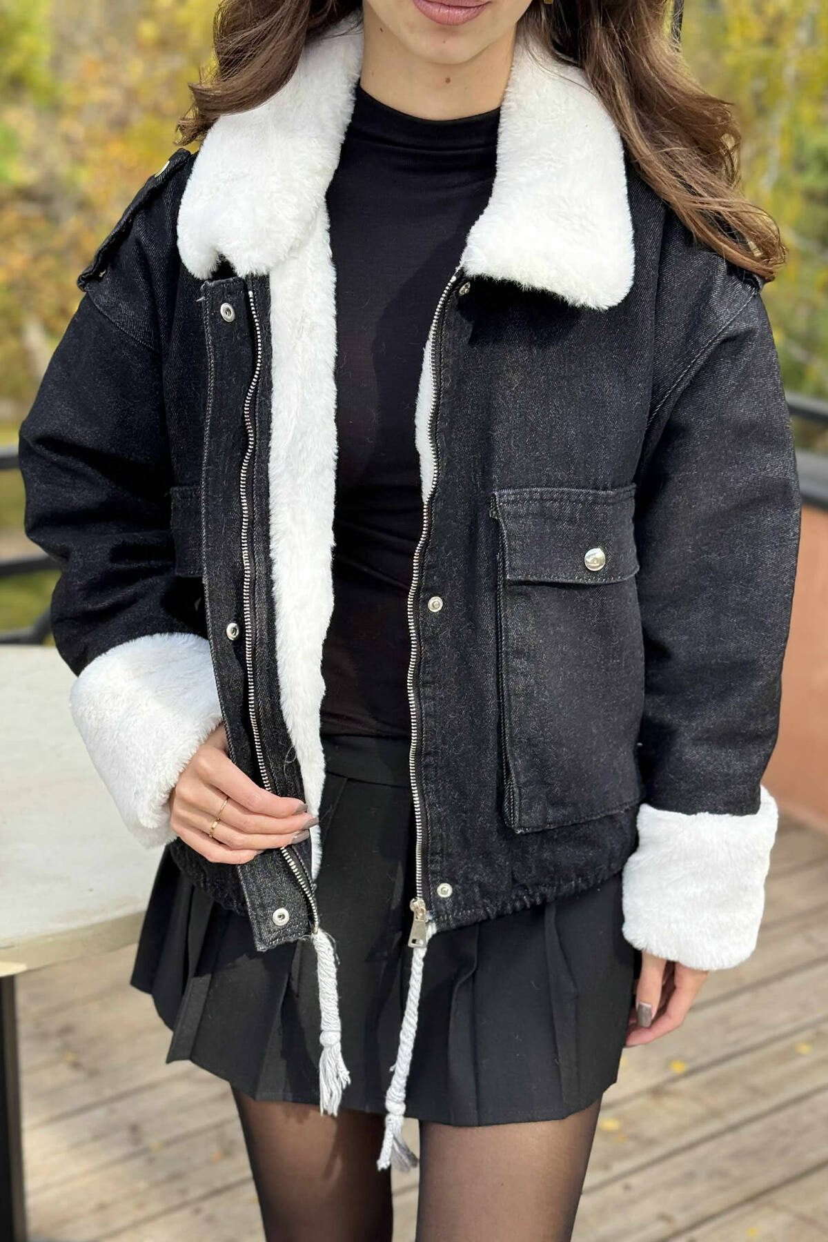 XHAKETË XHINS PËR FEMRA ME NJË PJESË PELLUSHI NË NGJYRË TË ZEZË