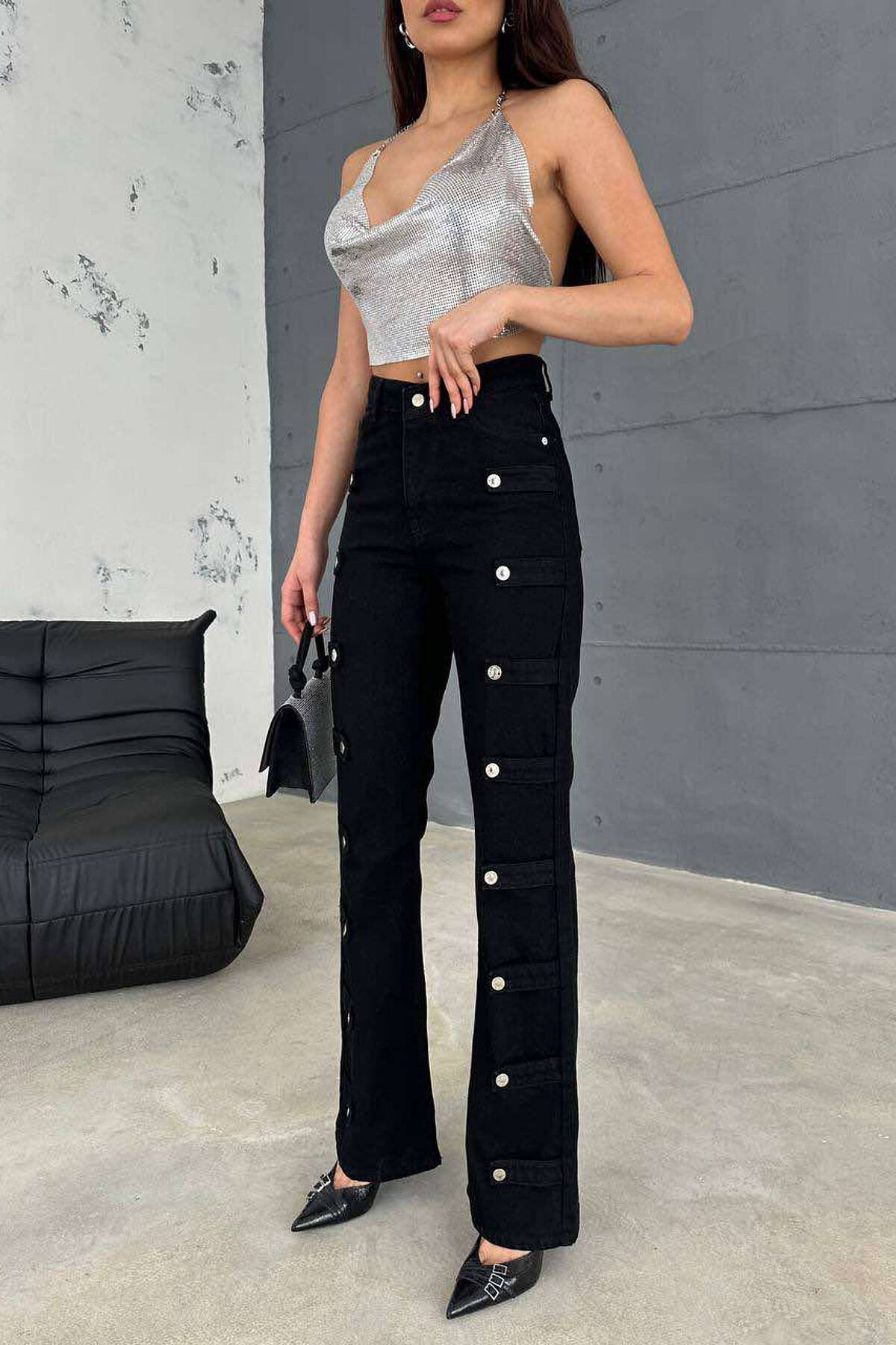 PANTALLONA TË GJERA ME DETAJIN E KOPSAVE PËR FEMRA NË NGJYRËN E ZEZË