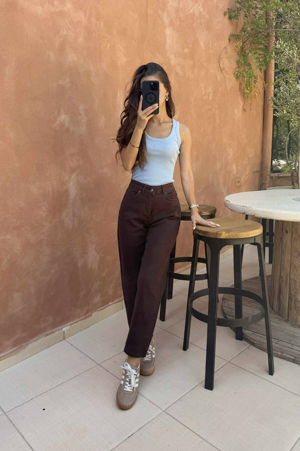 PANTALLONA ELASTIKE PËR FEMRA NË NGJYRËN KAFE E ERRËT