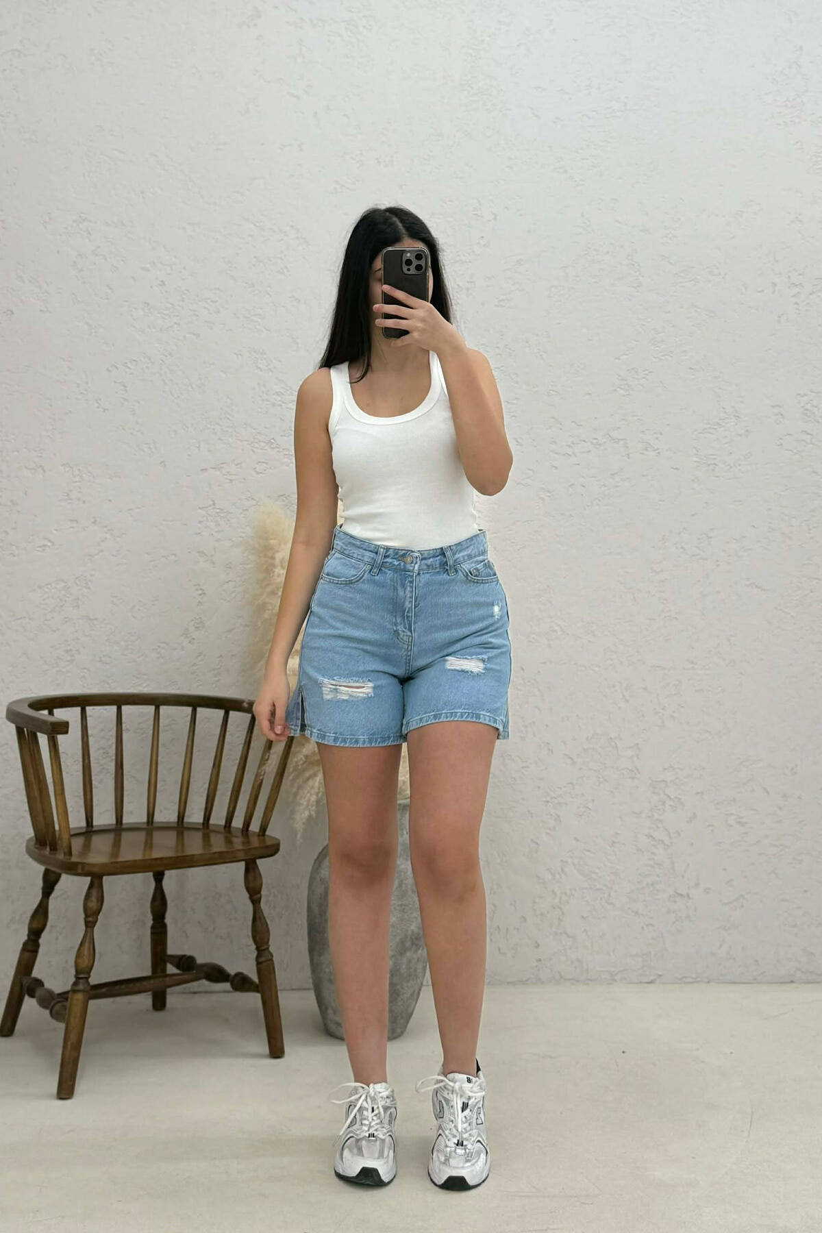 RIPPED KNEE HIGH WAIST DENIM WOMAN SHORTS LIGHTBLUE/BZ