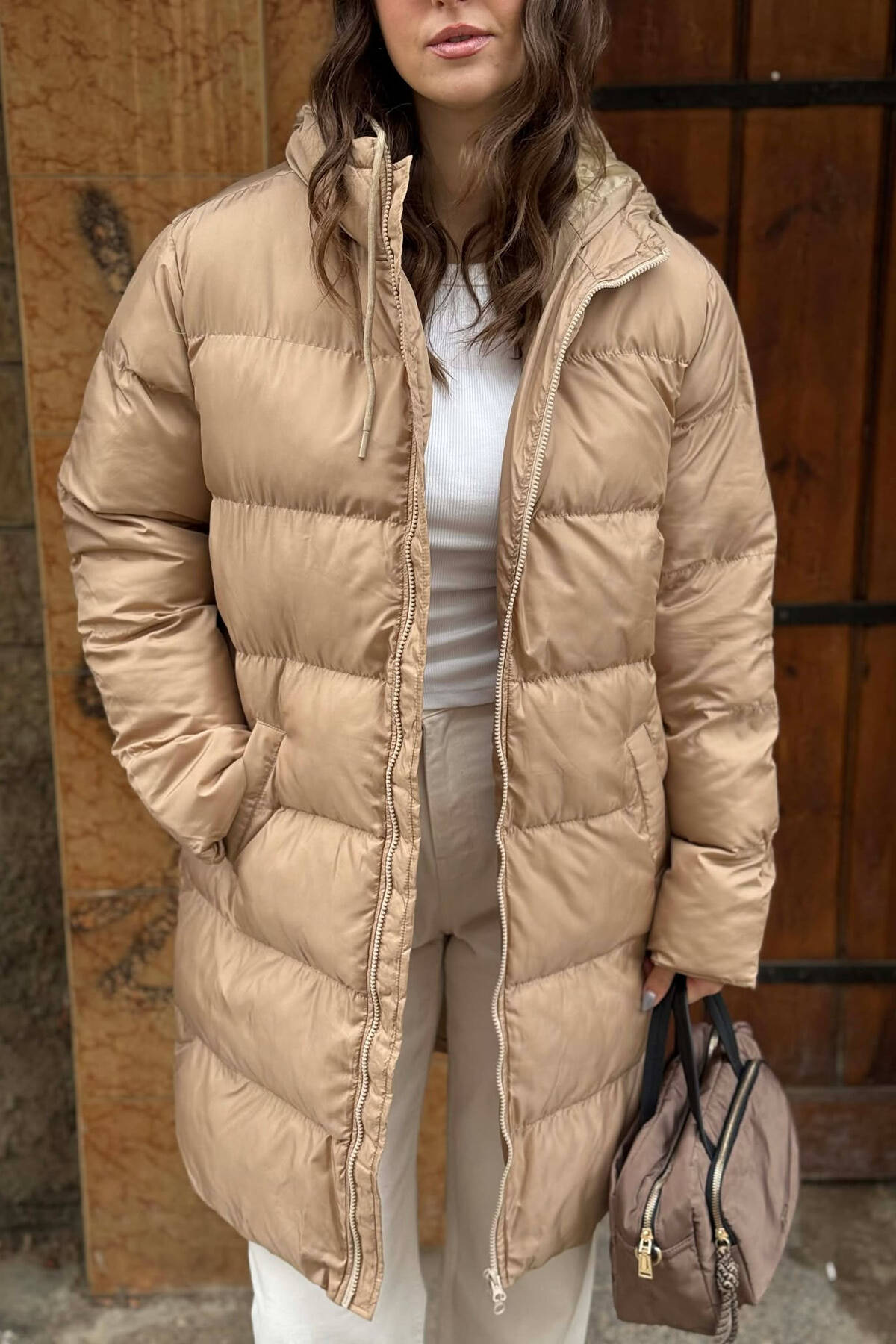 XHUP NJE NGJYRESH ME KAPUÇ DHE ZINXHIR PER FEMRA NE NGJYRE BEZHE