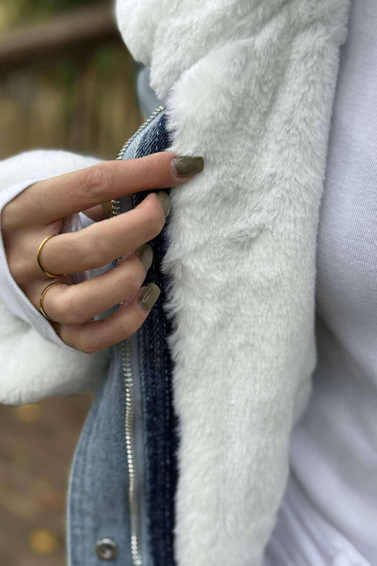Sjellim per ju xhaketen xhins e cila ka nje pjese pellushi ne ngjyre te bardhe tek krahet dhe pjesa e qafes per ta bere veshjen tuaj me te vecante dhe per tju mbajtur ngrohte ne cdo dite .
