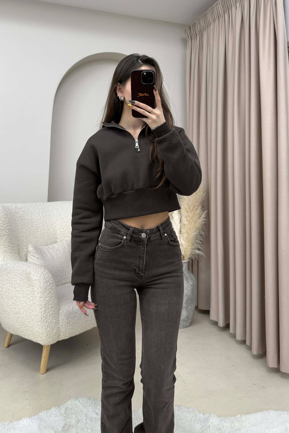 ZIPPER NECK CROPPED FLUFFY WOMEN SWEATSHIRT DARK BROWN/KAE