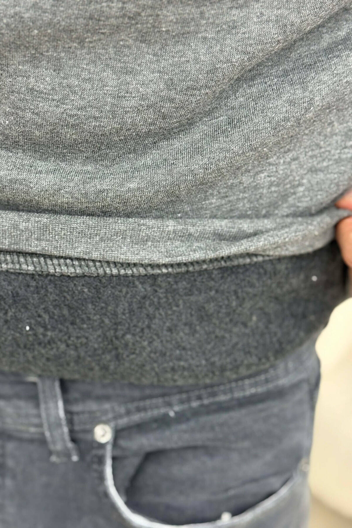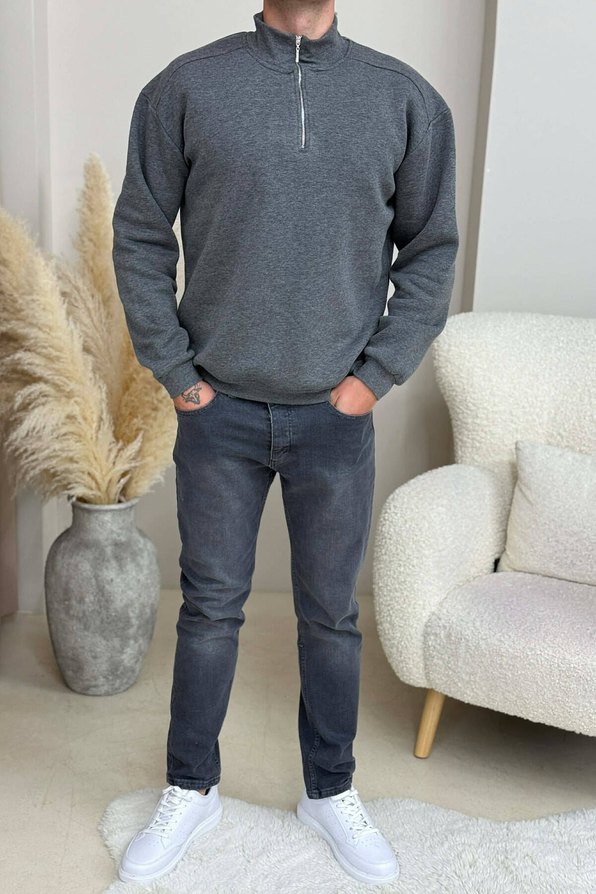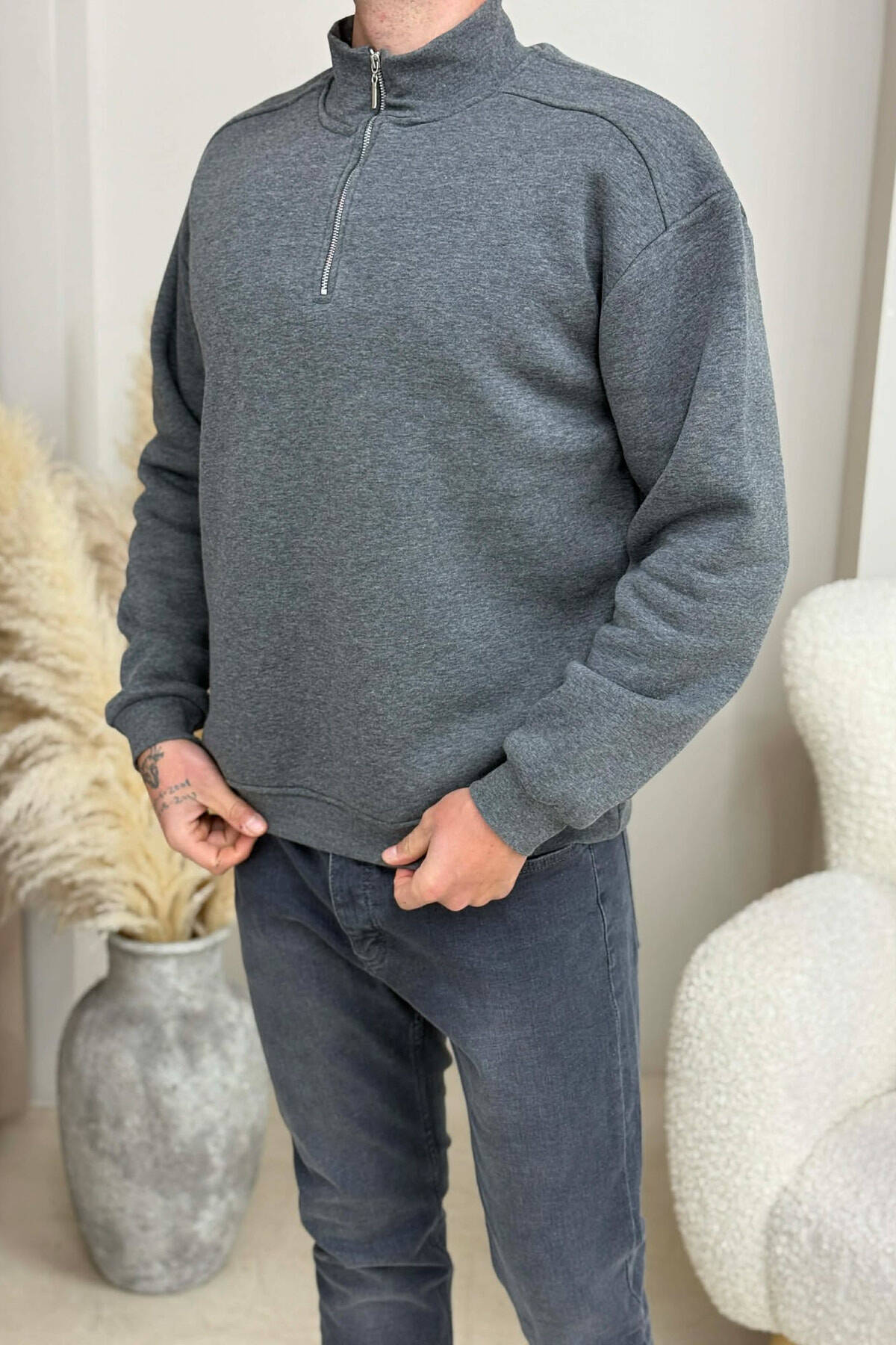 ZIPPER NECK FLUFFY MEN SWEATSHIRT DARK GREY/GEE