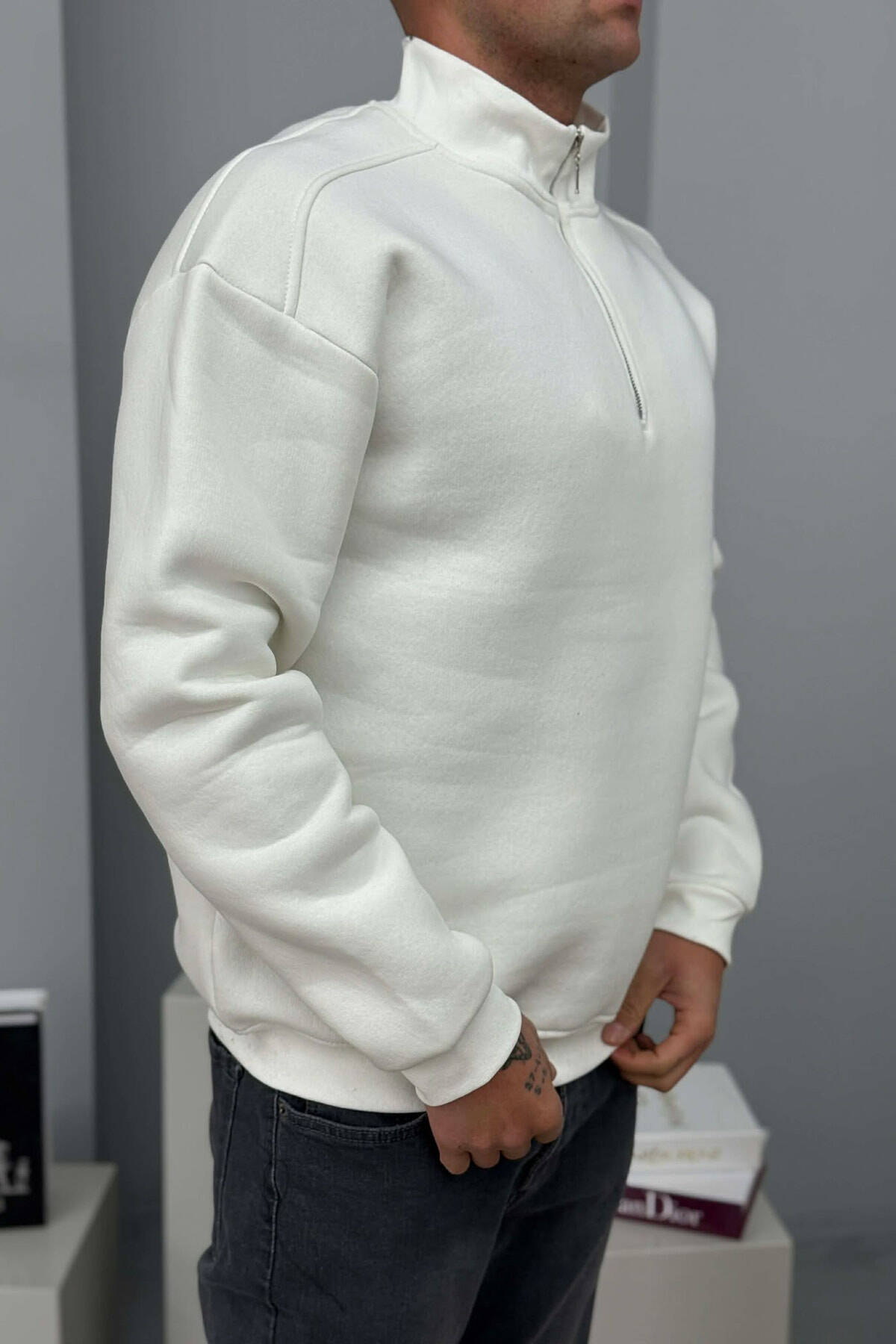 ZIPPER NECK FLUFFY MEN SWEATSHIRT WHITE-E BARDHE