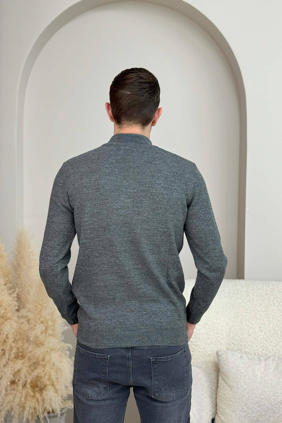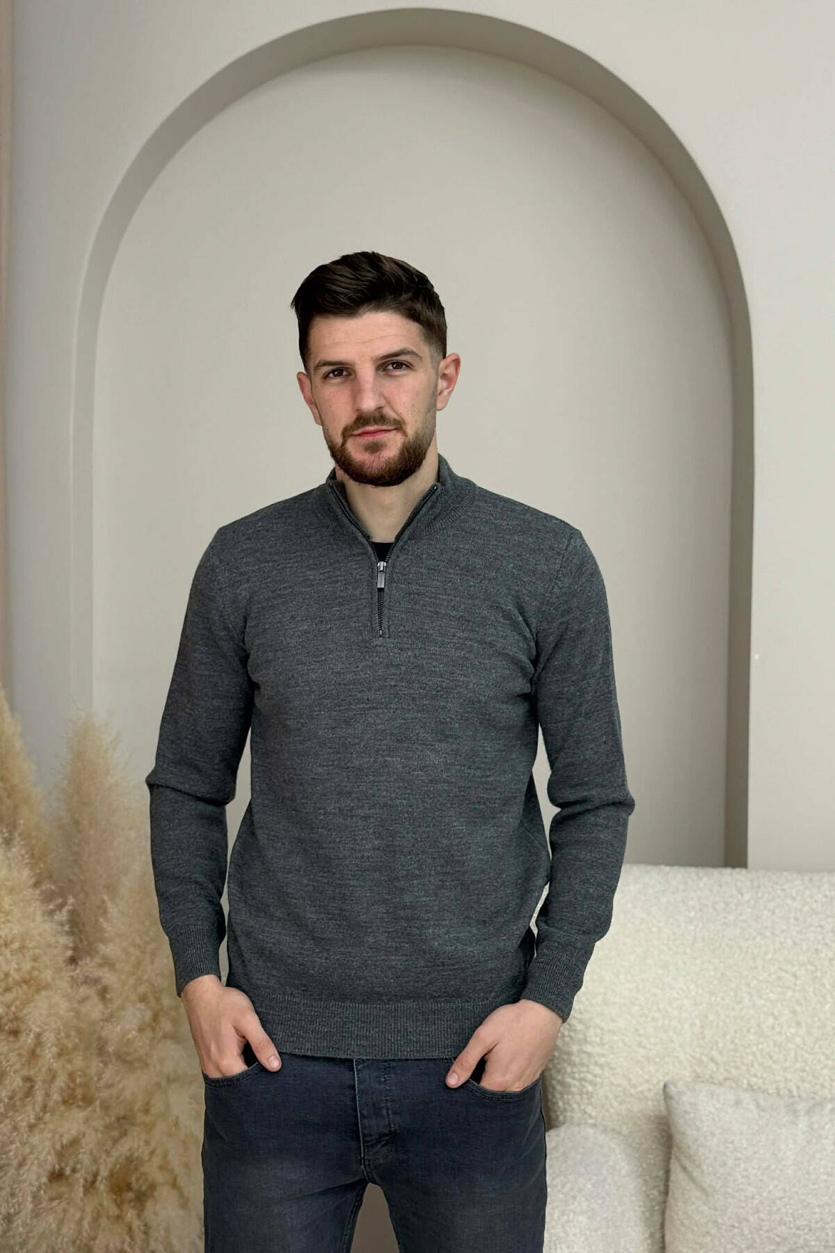 ZIPPER NECK ONE COLOR MEN SWEATER DARK GREY/GEE
