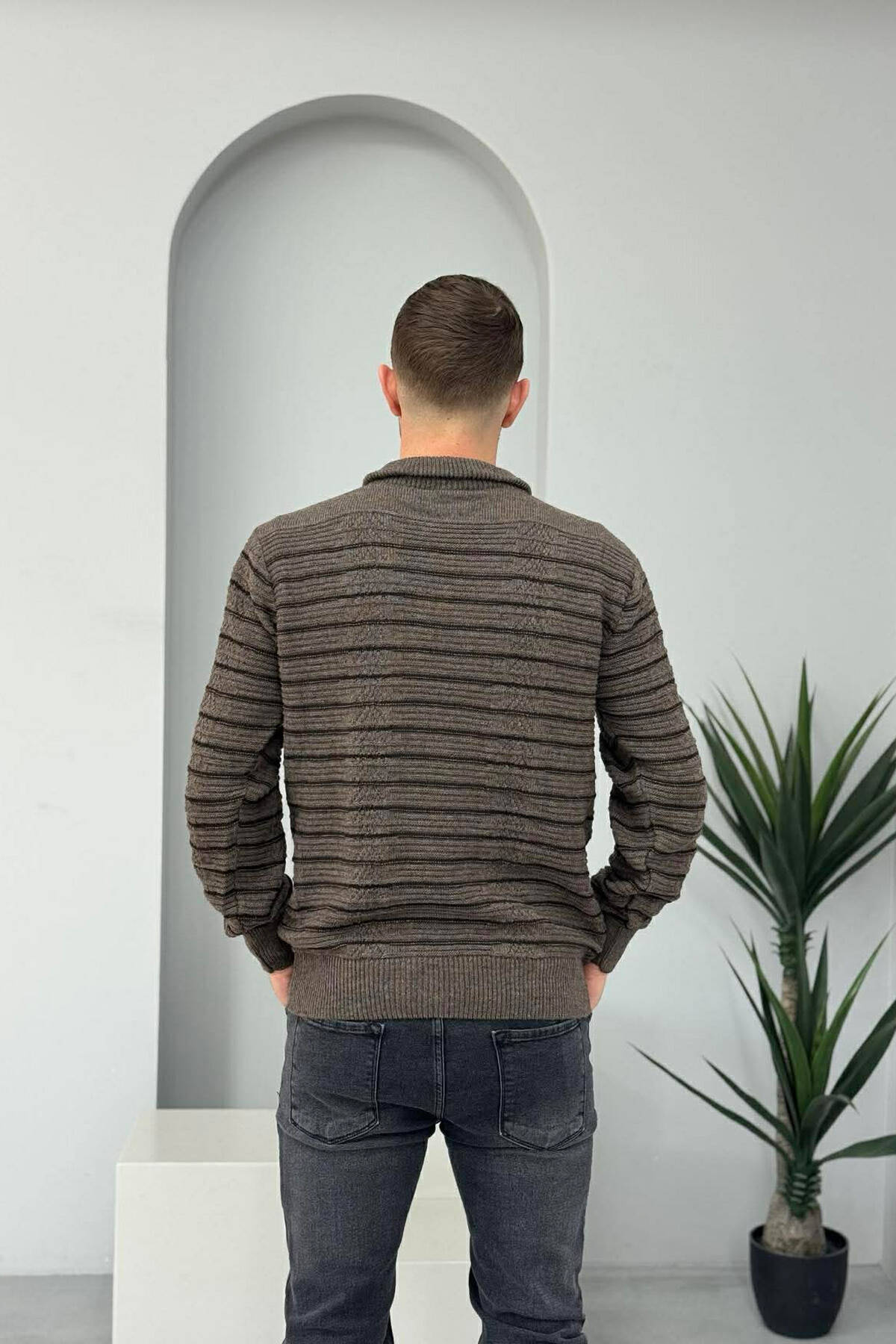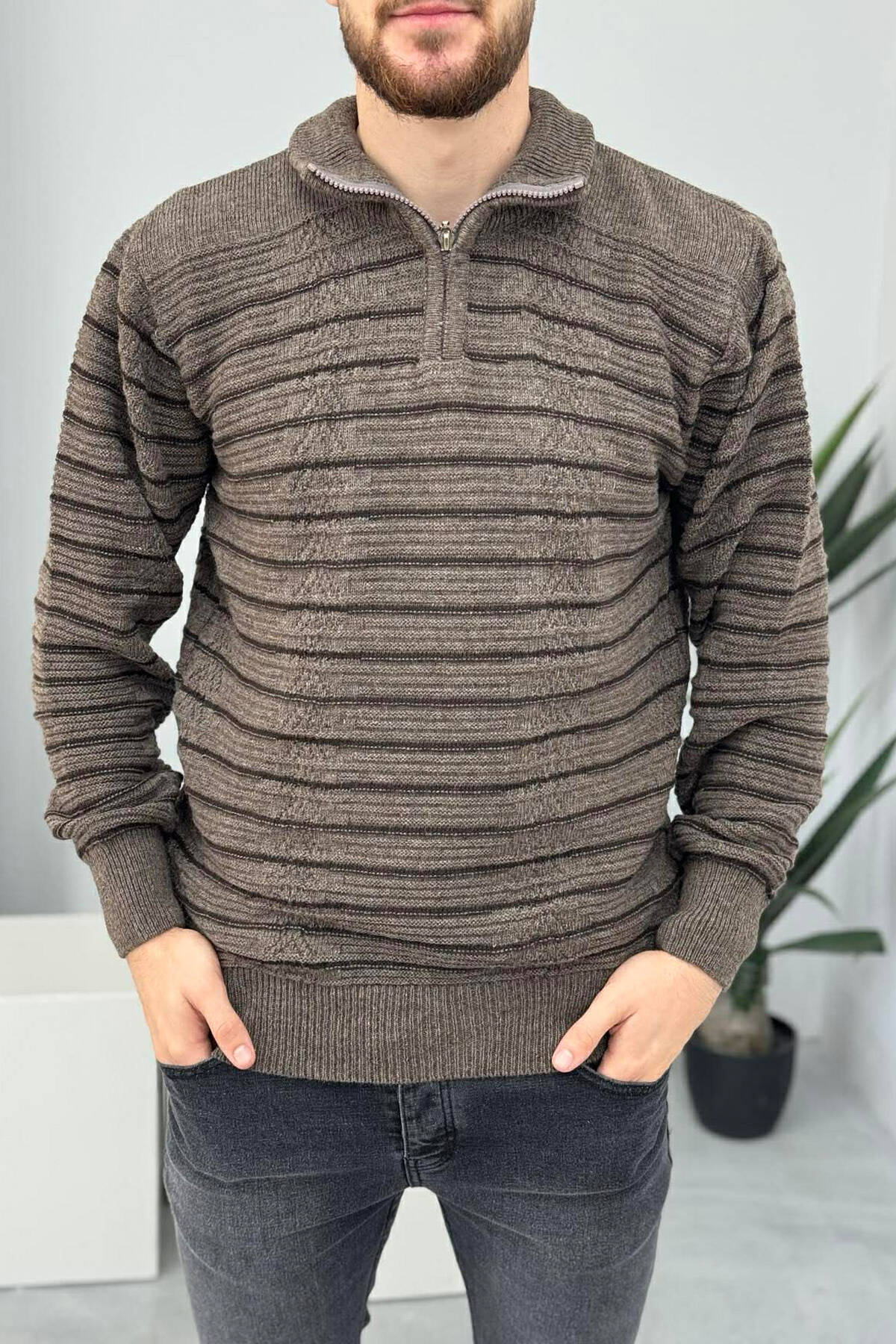 ZIPPER NECK SIMPLE MEN SWEATER BROWN/KAFE