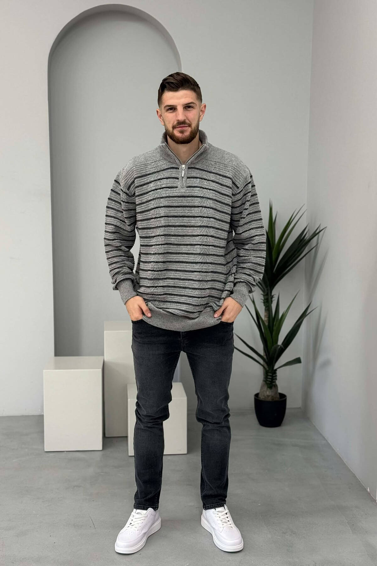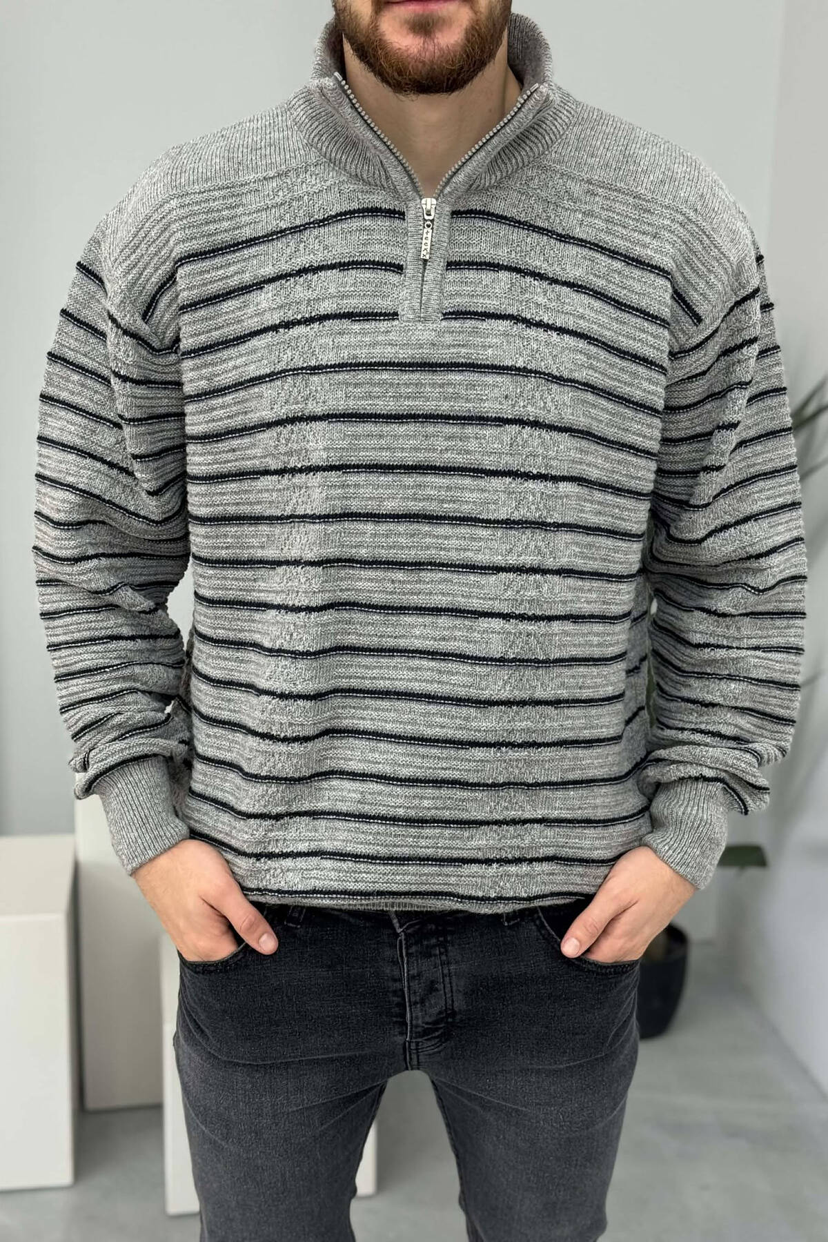ZIPPER NECK SIMPLE MEN SWEATER GREY/GRI