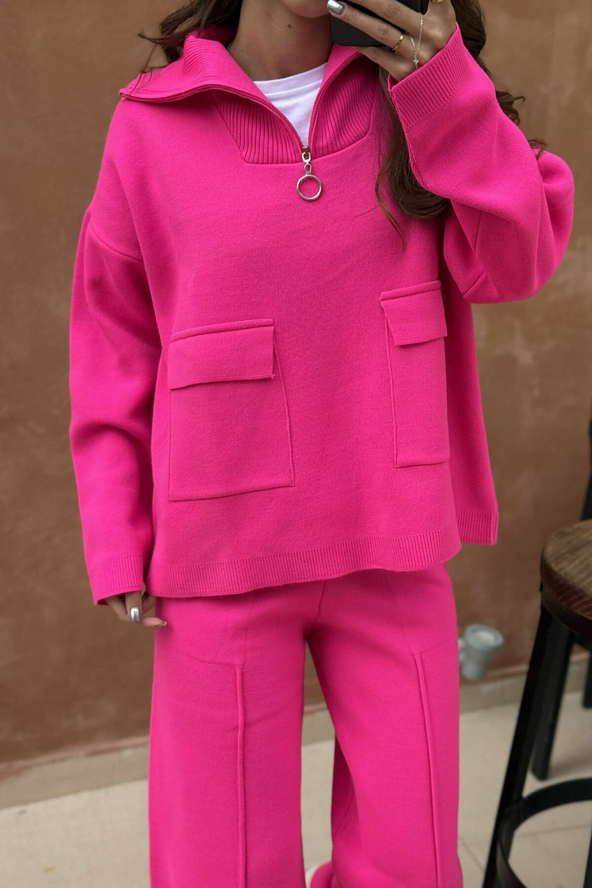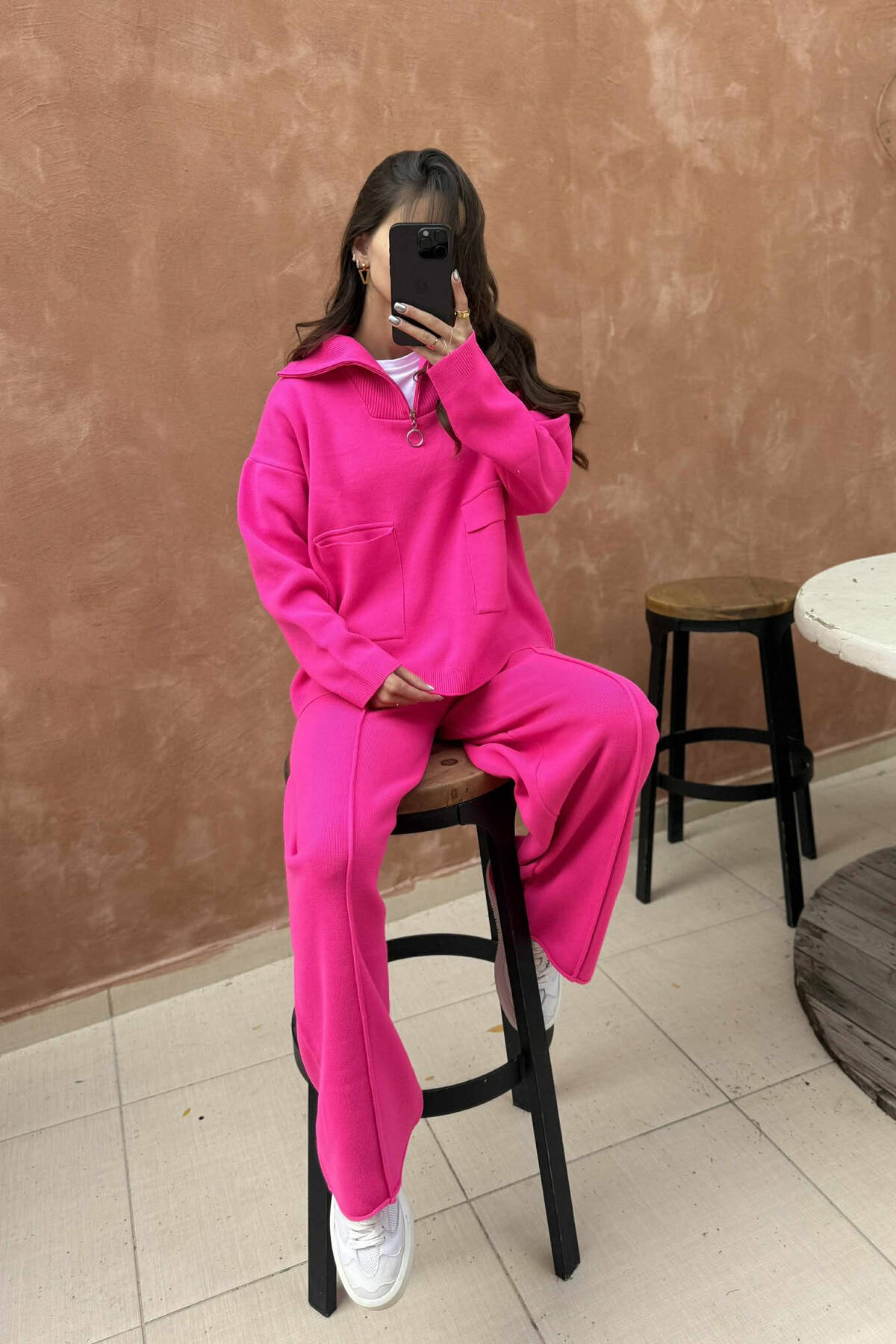 ZIPPER NECK SWEATER+TROUSERS WOMEN KNIT SET FUCHSIA/CIKLAMI