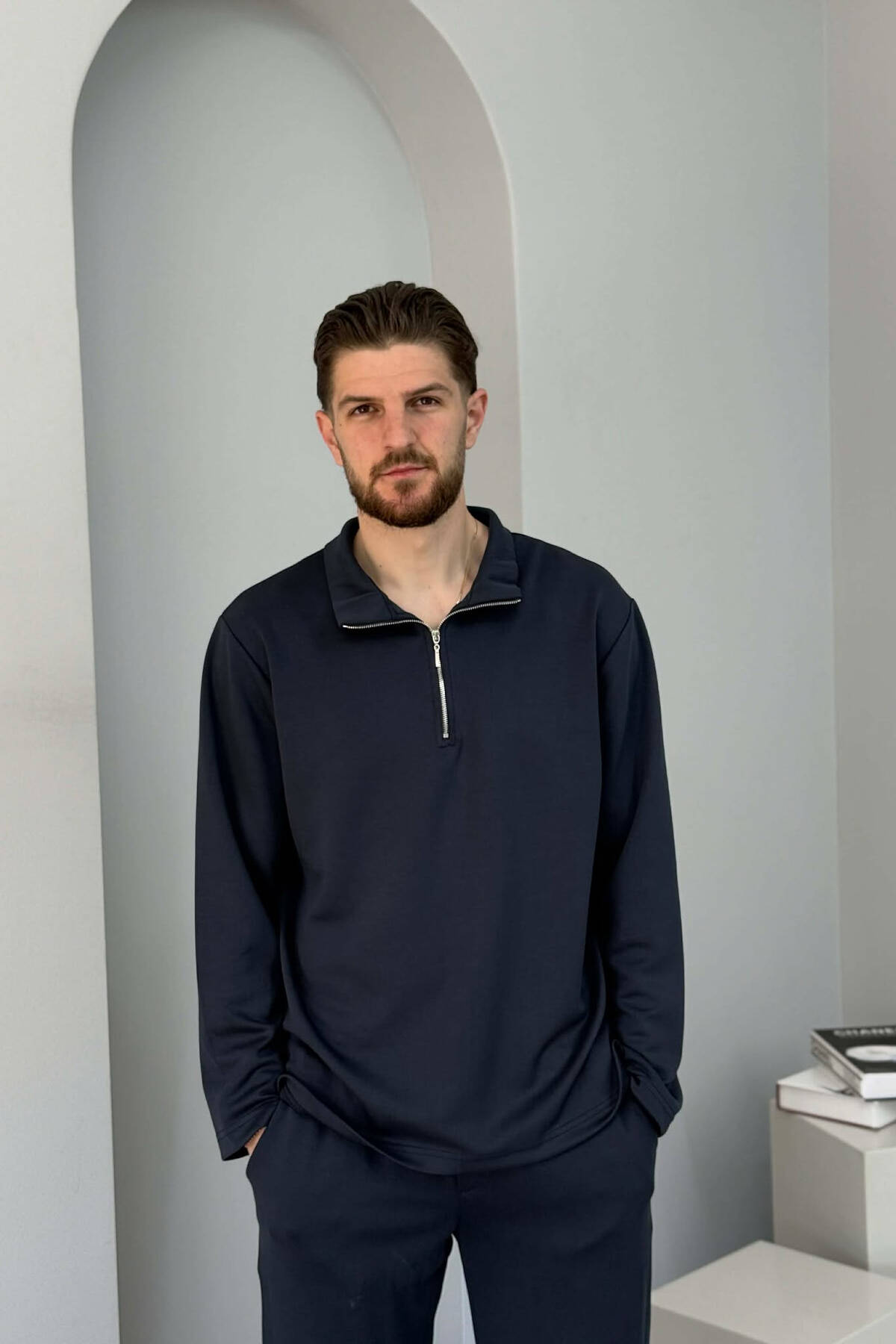 ONE COLOR ZIPPER NECK SWEATSHIRT+ SWEATPANTS MEN SET DARK BLUE/BEE