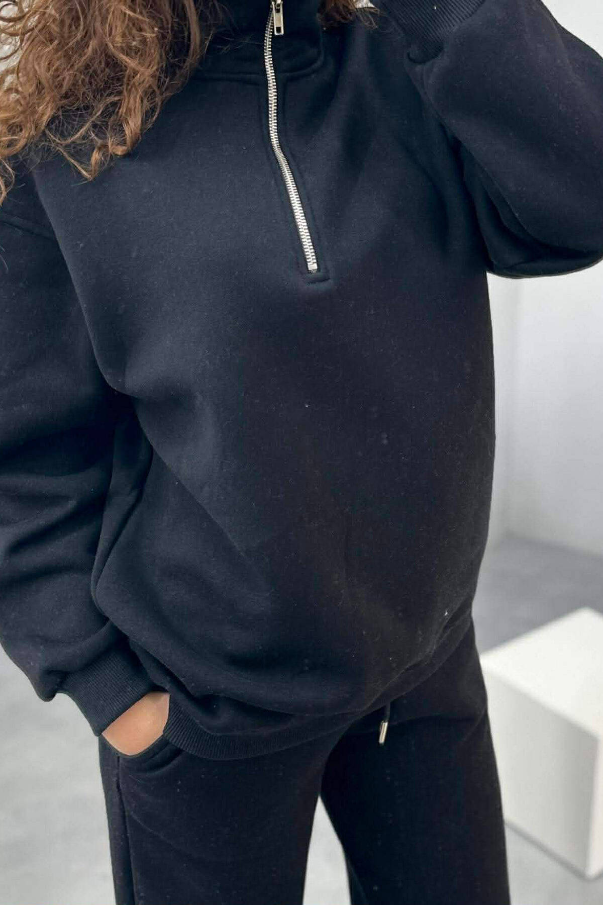 ZIPPER NECK SWEATSHIRT+SWEATPANTS FLUFFY WOMEN SET BLACK/ E ZEZE