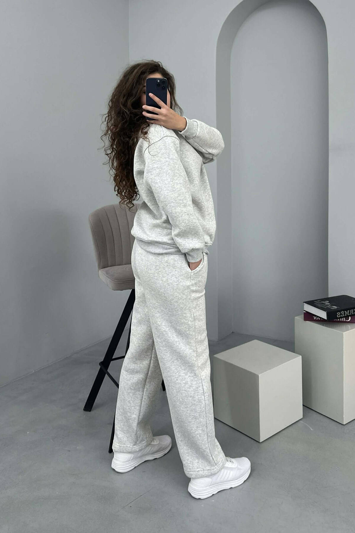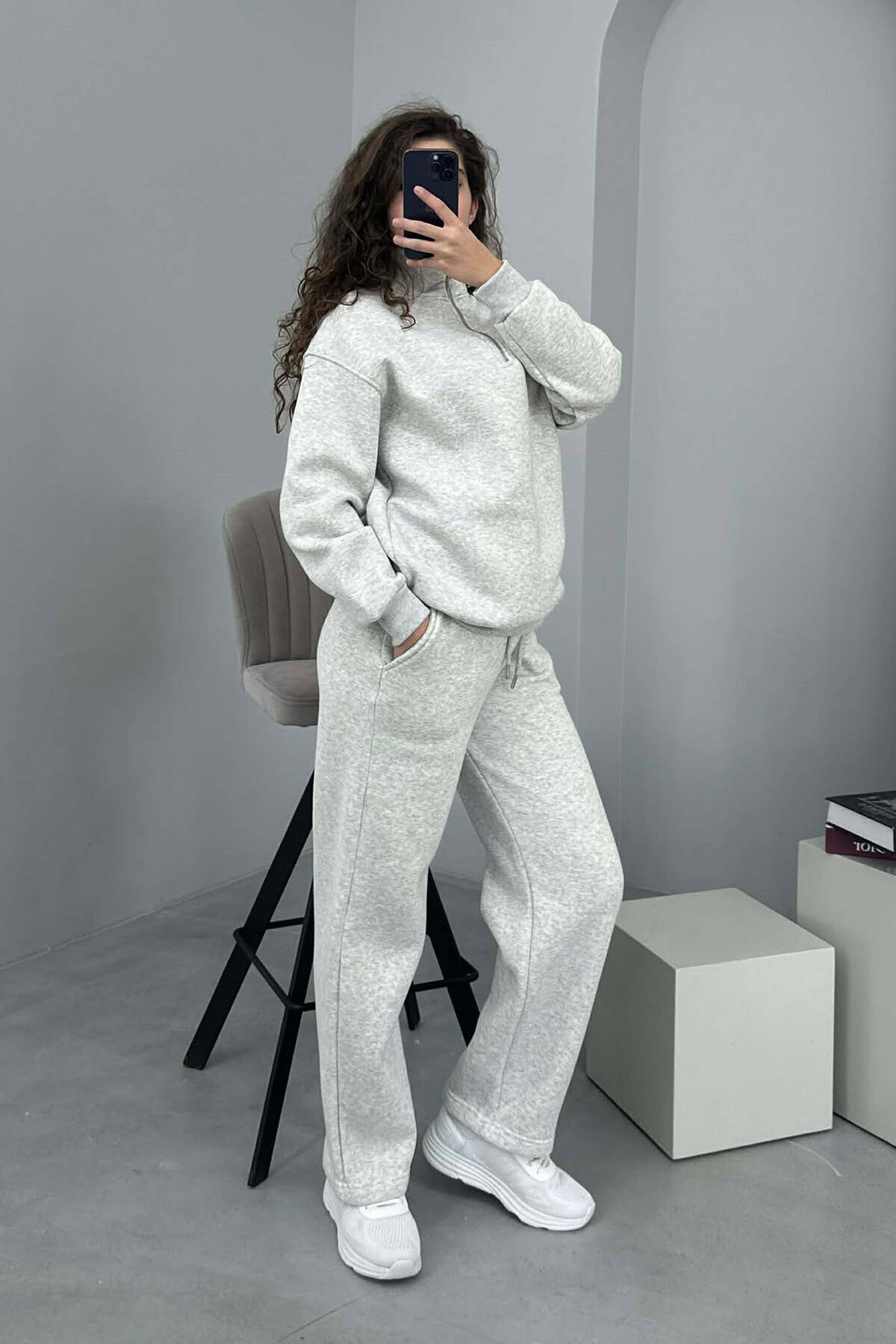 ZIPPER NECK SWEATSHIRT+SWEATPANTS FLUFFY WOMEN SET LIGHT GREY/GZ