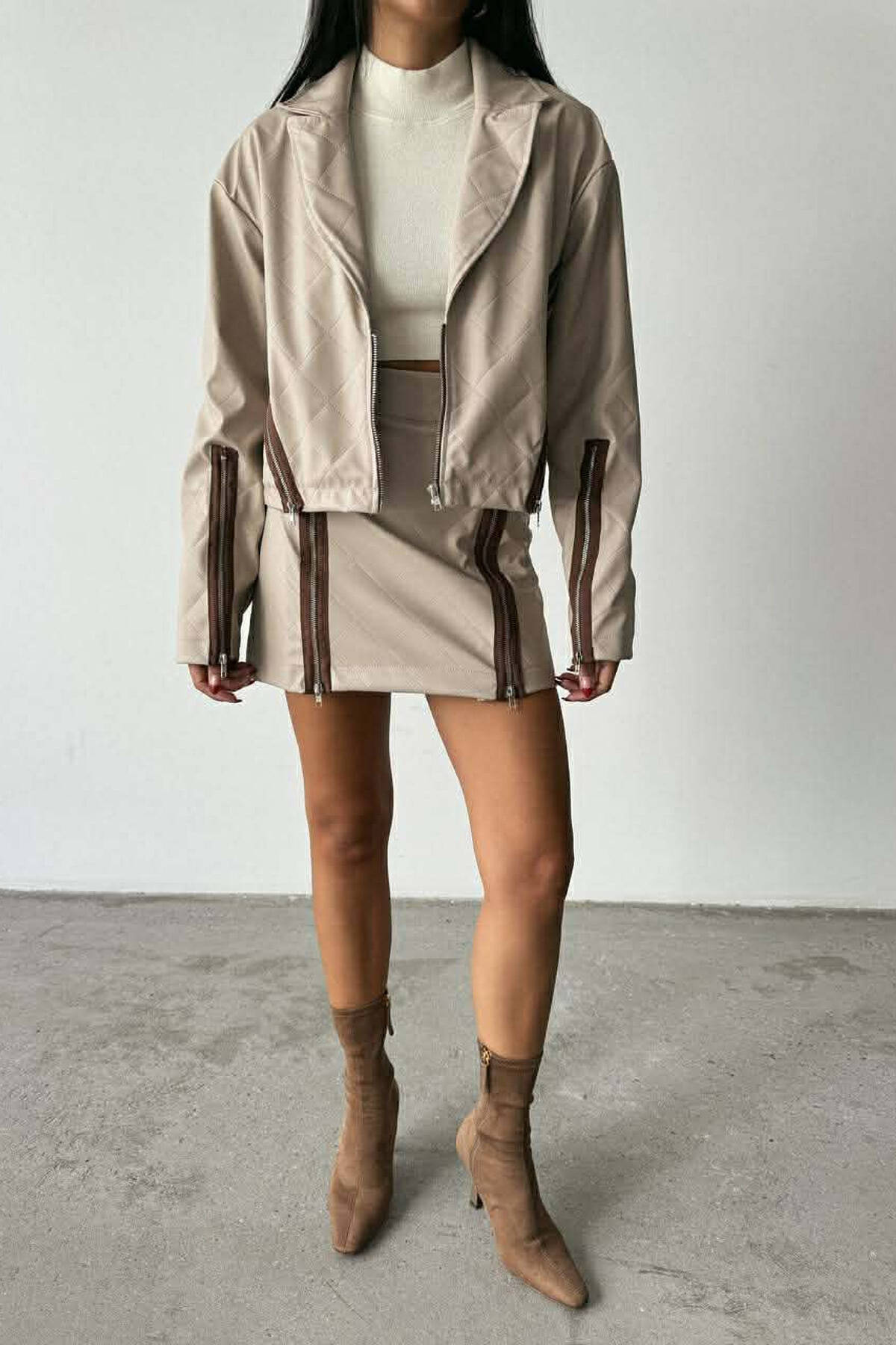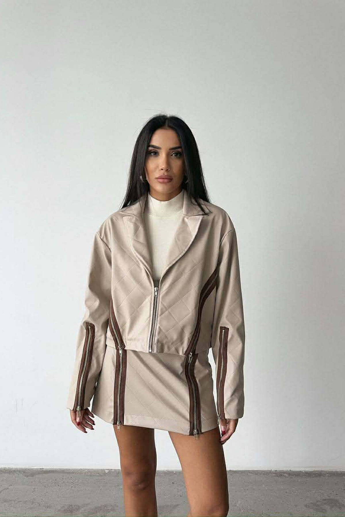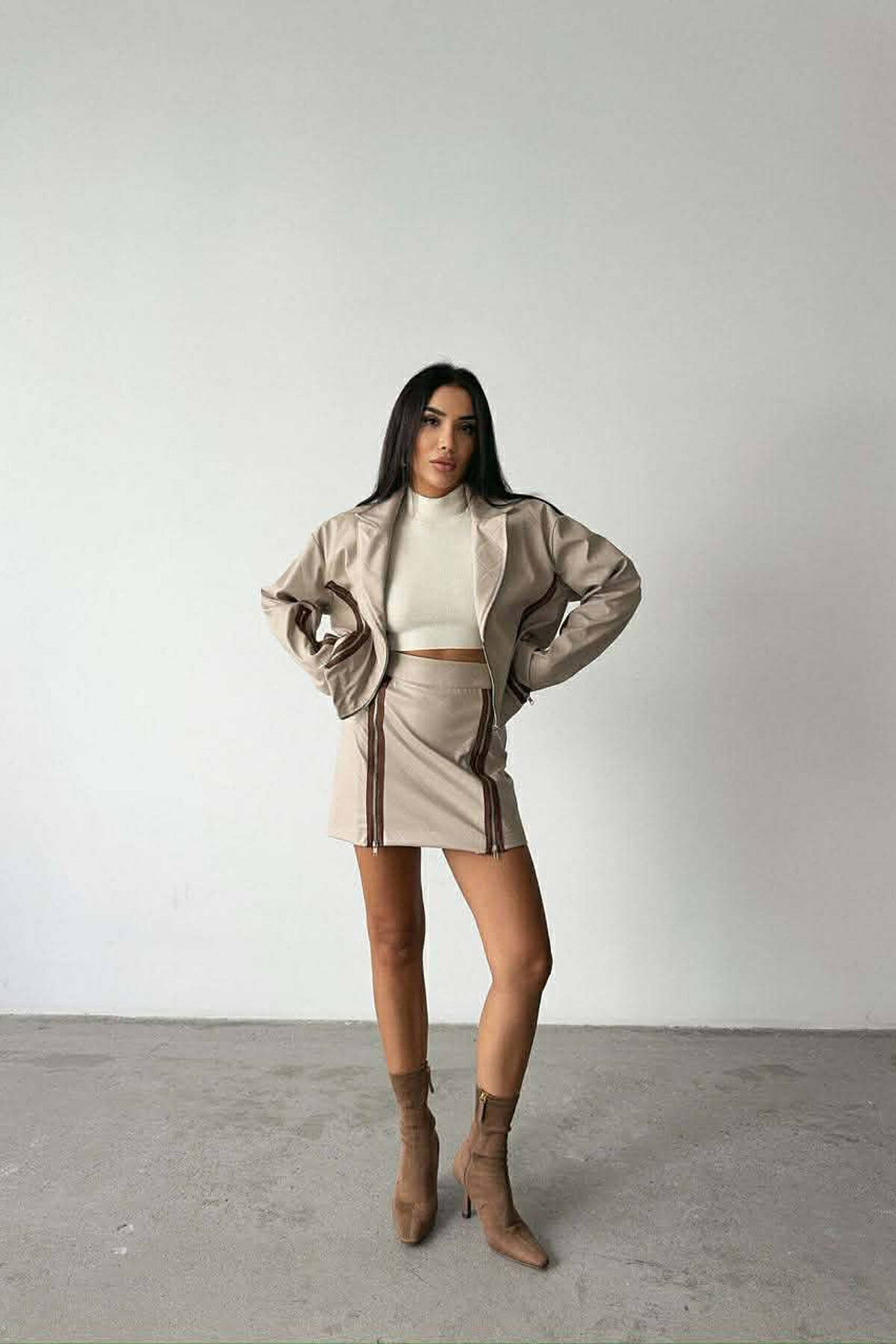 ZIPPERS DETAIL JACKET+SKIRT LEATHER WOMEN SET BEIGE/BEZHE